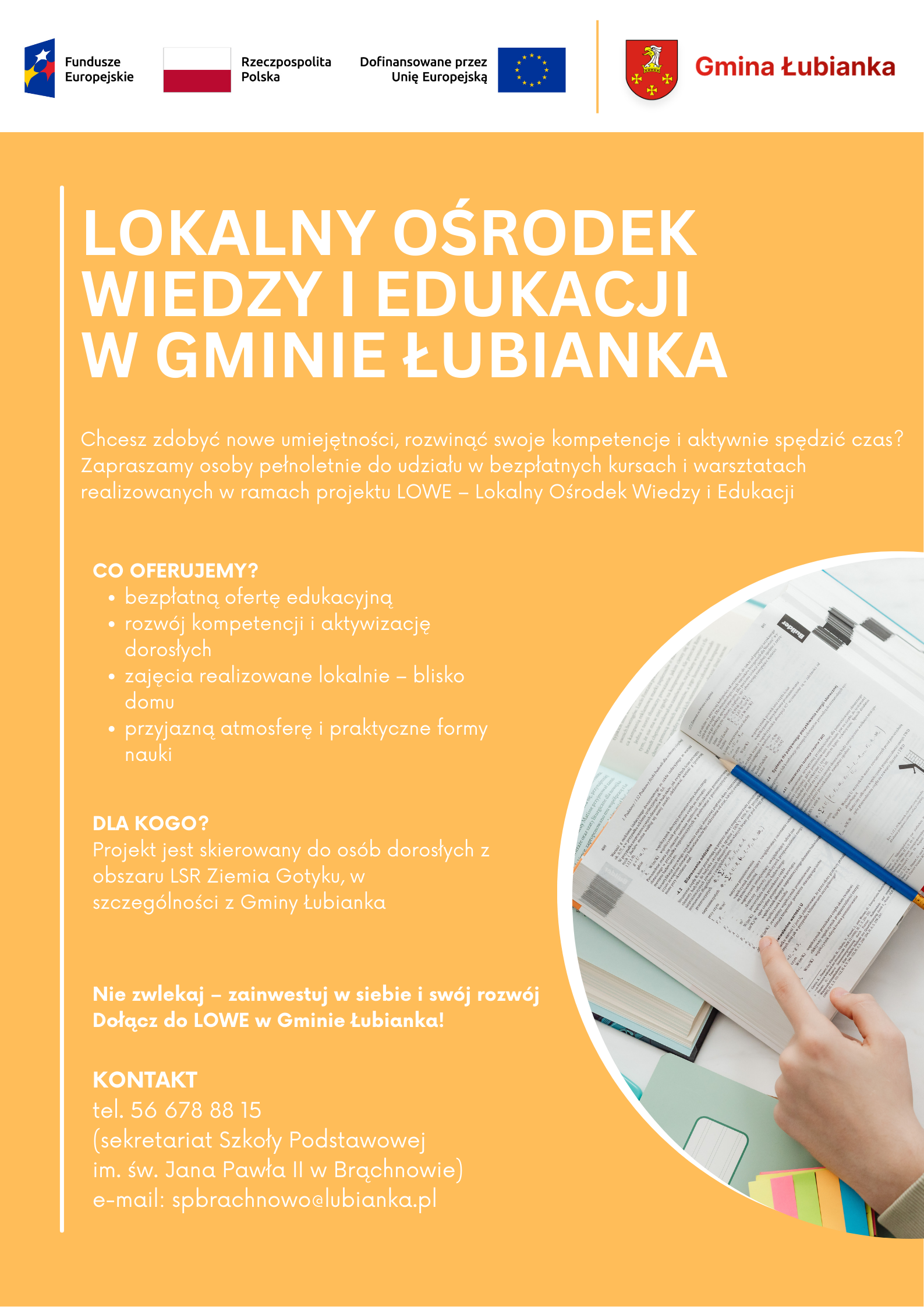 Gmina Łubianka zaprasza osoby dorosłe z obszaru LSR Ziemia Gotyku, w szczególności z Gminy Łubianka do uczestnictwa w projekcie pn. „Lokalny Ośrodek Wiedzy