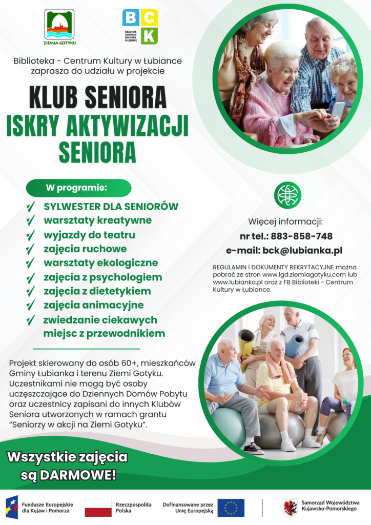 Centrum Inicjatyw Kulturalnych Gminy Chełmża zaprasza mieszkańców obszaru LSR Ziemia Gotyku, w szczególności Gminy Chełmża, które ukończyły 60 r.ż. do uczestnictwaw projekcie pn. „Utworzenie klubu seniora w Grzywnie” w ramach Programu Fundusze Europejskie dla Kujaw i Pomorza 2021-2027 współfinansowanego ze środków Europejskiego Funduszu Społecznego Plus w ramach Działania FEKP.07.04 Wspieranie integracji społecznej – Instytucja Zarządzająca