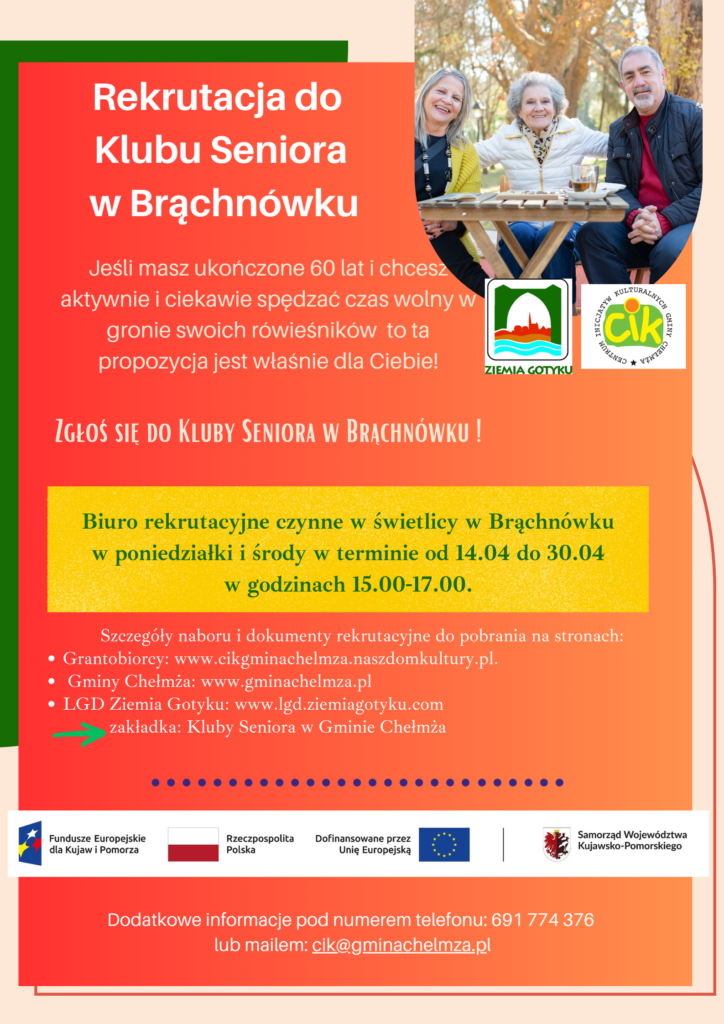 Centrum Inicjatyw Kulturalnych Gminy Chełmża zaprasza mieszkańców obszaru LSR Ziemia Gotyku, w szczególności Gminy Chełmża, które ukończyły 60 r.ż. do uczestnictwaw projekcie pn. „Utworzenie klubu seniora w Brąchnówku” w ramach Programu Fundusze Europejskie dla Kujaw i Pomorza 2021-2027 współfinansowanego ze środków Europejskiego Funduszu Społecznego Plus w ramach Działania FEKP.07.04 Wspieranie integracji społecznej – Instytucja Zarządzająca