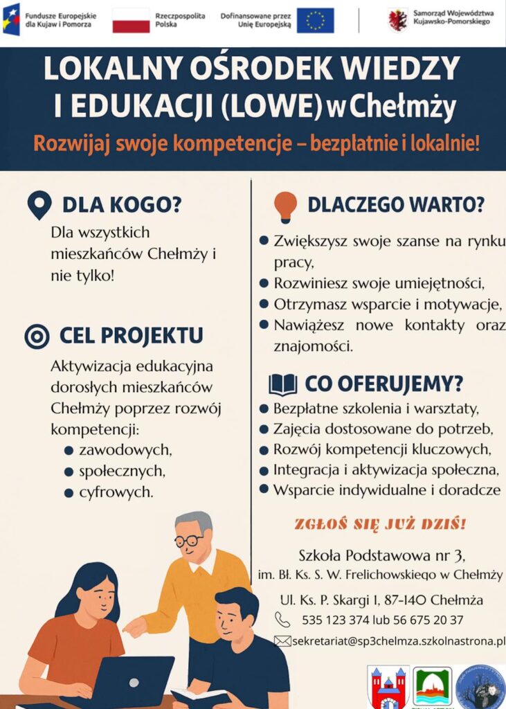 Gmina Miasta Chełmża zaprasza osoby dorosłe z obszaru LSR Ziemia Gotyku, w szczególności z Gminy Miasta Chełmża do uczestnictwa w projekcie pn. „Lokalny Ośrodek Wiedzy i Edukacji w Chełmży” w ramach Programu Fundusze Europejskie dla Kujaw i Pomorza 2021-2027 współfinansowanego ze środków Europejskiego Funduszu Społecznego Plus w ramach Działania FEKP.07.03 Aktywizacja edukacyjna osób dorosłych – Instytucja Zarządzająca Programem – Zarząd Województwa Kujawsko-Pomorskiego.